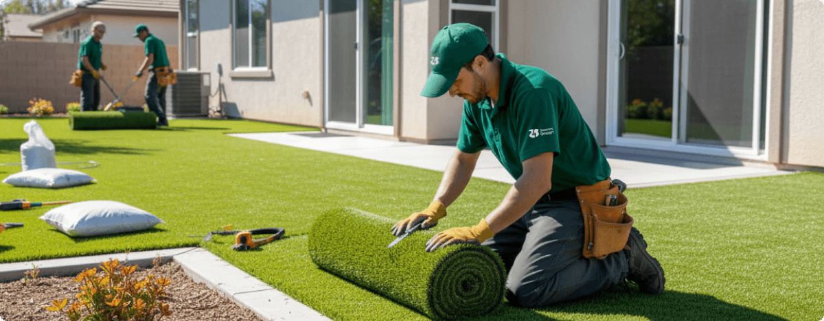 Your chosen artificial turf is rolled out, trimmed to fit your space perfectly, and aligned for a natural look.